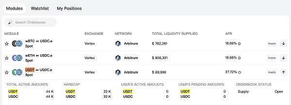 Elixir上的USDT/USDC现货交易对目前APR为27.72%,流动性只有9万美元。但APR中有15%是ARB奖励,所有交易对一起计算,即增加这个交易对的流动性不会导致这一部分奖励被大幅稀释,其余部分奖励为锁定的VRTX。