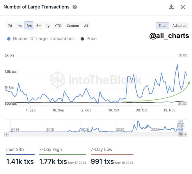 狗狗币 (DOGE) 上个月的交易量大幅飙升,超过 100,000 美元,不断创出新高。著名分析师阿里·马丁内斯 (Ali Martinez) 表示,这一显着增长表明机构参与者和大型投资者对 DOGE 的兴趣日益浓厚,引发了人们对近期价格可能大幅上涨的猜测。
