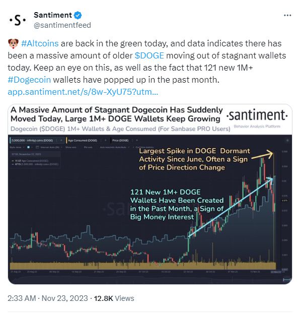 这一趋势与持有超过 100 万 DOGE 的钱包的创建趋势同时发生,表明重要投资者的兴趣日益浓厚。链上分析公司 Santiment 强调,旧 DOGE 从休眠钱包转移的显着激增是加密货币市场动态的一个值得注意的发展。
