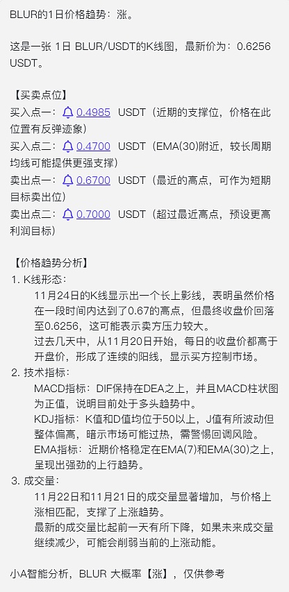 以上是对Blur价格走势及买卖点位的完整分析。需要注意的是,此分析内容仅由智能分析机器人小A生成,仅供参考,不构成投资建议。