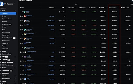 盈利型项目更容易理解,就是项目本身有直接收入,最好的情况是收入能够覆盖支出的项目。通过 defillama 可以直接查看到众多项目的协议收入情况。目前排名第一的是 Maker DAO,最近 24 小时协议收入为 50 万美元。如果读者有一定股票投资经验,必然能理解公司收入对于估值判断的重要性。如果熊市一个项目是零收益,同时项目 Token 还在持续释放流通,那么必然陷入一个慢性死亡的死亡螺旋。当然项目方也会积极寻找 VC 这样的「白衣骑士」,通过融资来解决困境。