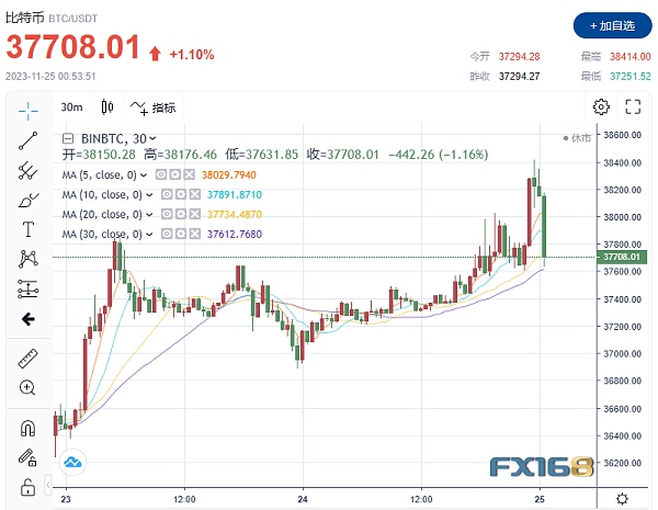 比特币一度上涨2%,达到38414.00美元,为2022年5月以来的最高水平。本周,比特币收盘有望上涨5%。