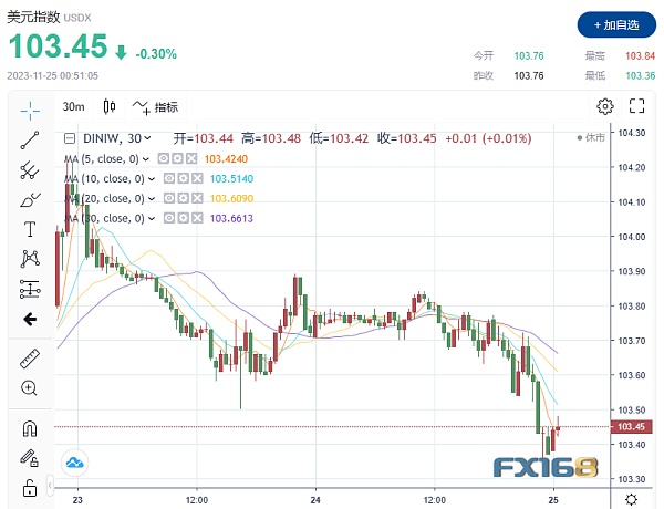 衡量美元兑六种主要货币的美元指数下跌近0.4%,至103.36低点,接近本周早些时候触及的两个半月低点103.17。