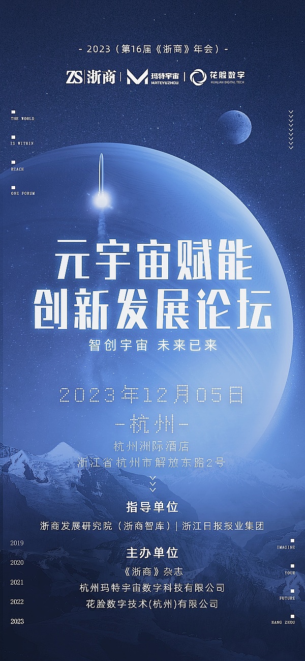 2023年12月5日,杭州这座科技与自然交织的城市将迎来一场科技与商业的交响。这场盛会由浙商、玛特宇宙、花脸数字共同主办,浙商发展研究院(浙商智库)、浙江日报报业集团指导,《浙商》全国理事会、浙商人工智能产业联盟协办。同时,行业知名媒体如浙商杂志、搜狐、新浪等将全程报道这一盛况。