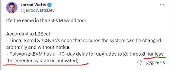 让人感到诧异的是,Optimism过去只是用一个EOA地址管理合约升级,连多签都是今年10月才加上去的。至于曾对Blast展开抨击的Polygon zkEVM,也可以在6/8多签授权下,对Rollup合约进行“紧急接管”,把Layer2从合约治理转为“赤裸裸的人治”。有趣的是,上文中对Blast进行批判的Polygon工程师也提到了这一点,但表现的含糊其辞。