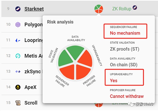按照L2BEAT的数据,目前Arbitrum、Optimism、Loopring、ZKSync Lite、ZkSync Era、Starknet、Polygon ZKEVM等主流Rollup都采用了多签授权的可升级合约,可以绕开时间锁限制立刻upgrade。(可以阅读极客web3往期文章:信用的游戏:被多签和委员会操控的Rollup们)