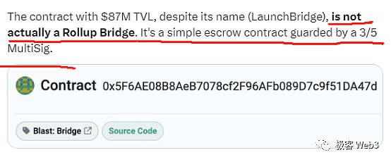 但Blast在获得阶段性成功的同时,也引来了许多专家的质疑。比如,L2BEAT和Polygon工程师均一语道破:目前的Blast只是在以太坊上部署了接收充值的Deposit合约而已,这个合约可以在3/5多签的控制下升级,换句话说,合约的代码逻辑可能被改写,想Rug还是可以Rug。同时,Blast只是自称要实现Rollup结构,但现在的它只是一个空壳子,连提款功能都要等到明年2月上线。