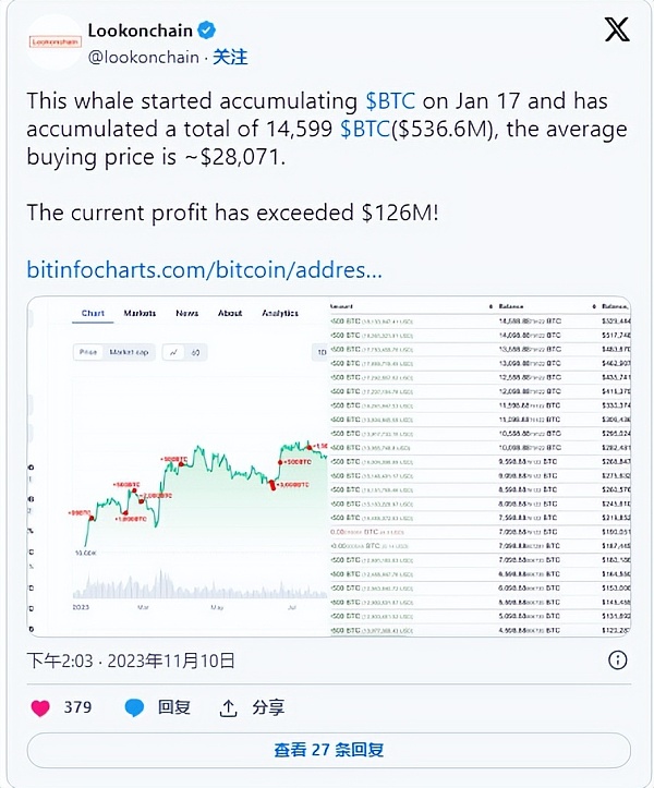 鲸鱼认为这次价格飙升是增持的最佳时机。一位著名的比特币鲸鱼最近购买了大量比特币,价值约 1500 万美元。
