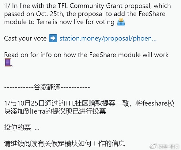 Terra的一些新开发很可能 为 LUNC 和 USTC 的价格注入新的活力。11 月初,Terra 团队在 X 帖子中宣布,继 10 月 25 日 TFL 社区资助提案获得批准后,他们已启动将 FeeShare 模块集成到 Terra 中的提案的投票流程。