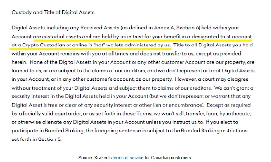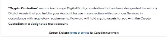 下划线的文字意思是,如果你是加拿大人,Kraken并不为你持有你的加密货币。这与美国的情况非常不同。相反,Kraken表示,客户的加密货币被视为"托管资产",并将你的加密货币委托给一个"指定的信托账户在一个加密货币托管人处"。就是了。这就是我之前提到的交易与保管的分离,这符合市场的标准做法。