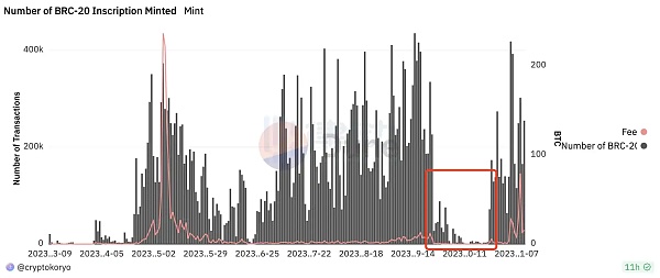 据 Dune 看板数据显示,Sophon 于 10 月 3 日激活后,基于文本的铭文从前一天的 49,000 个骤降到 13,700 个,下降了 72%。10 月 23 日,Sophon 的资金耗尽后的第二天,数量从 11,500 个升至 74,300 个,增幅达 540%。