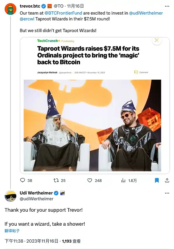 与传统 Crypto 圈里 VC 所拥有的话语权不同,Udi Wertheimer 并没有给他特别的待遇,只是在 @TO 的评论下面回复:「谢谢你的支持!如果你想要巫师,就去洗澡吧!」