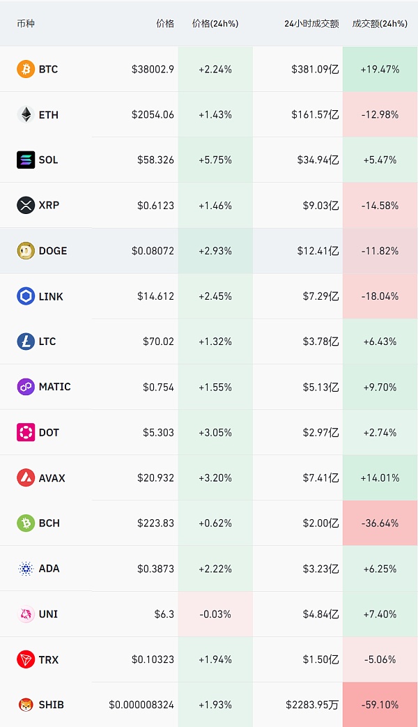 比特币(BTC)过去24h直线拉升,现涨1.27%,最高报38326美元,最低报36780美元,波动率放大至4.06%。