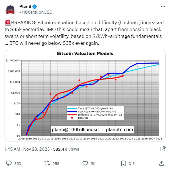 在这些市场波动中,股票流量模型的创建者 PlanB 自信地断言,比特币的价格不太可能再次跌破 35,000 美元。