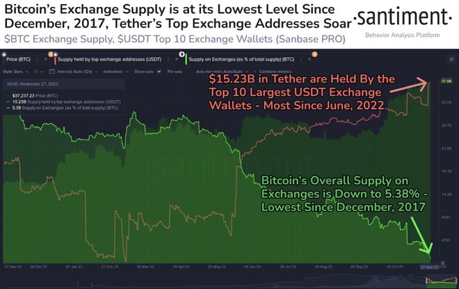 随着交易所供应量降至5年低点 比特币(BTC)跃升至 38,000 美元