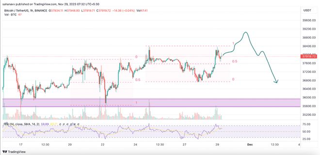 TradingView 数据显示价格动态发生变化,比特币周一跌至 36,715 美元的低点,随后出现看涨逆转,领先的加密货币达到 38,315 美元的峰值,然后遇到空头的阻力。