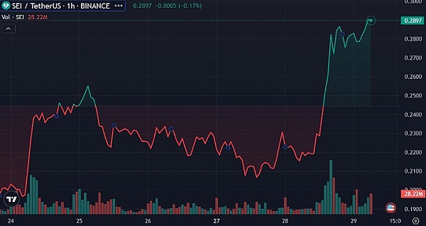 SEI 在过去 24 小时内飙升 35%,目前交易价格为 0.295 美元,创下新高。截至撰写本文时,该资产的市值为 6.45 亿美元。数据显示,Sei 的日交易量已超过其市值,徘徊在 6.56 亿美元大关附近。