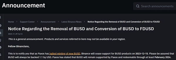 在今年2月13日,币安前首席执行官赵长鹏称由于BUSD陷入监管局面,并无法铸发新币,于是在当下就果决放弃BUSD作为交易对用的主要代币。Paxos随后宣告将终止与币安在BUSD的合作关系,并表示现有的BUSD将继续得到Paxos全面支持,至少在2024年2月之前仍然得到充分支持和赎回。