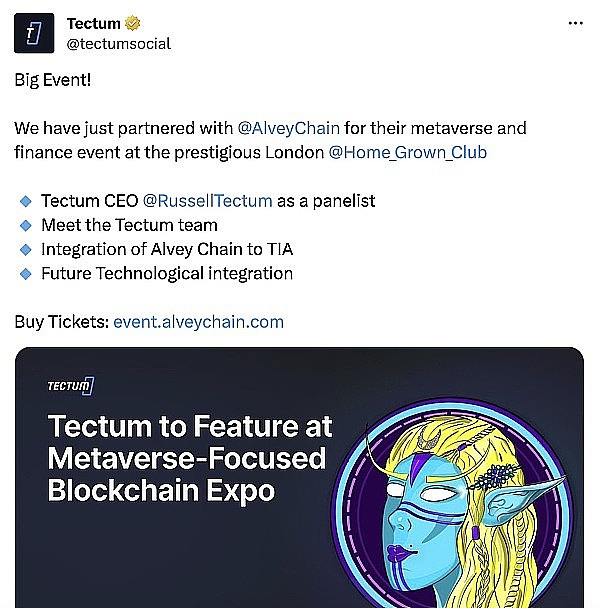 就在前几日,赞助商之一Tectum,已经在Twitter上和AlveyChain互动,介绍了此次的VR大会,如果其他赞助商也陆续发布Twitter和AlveyChain互动,凭借币安苹果摩根大通的强大人气,想必会将AlveyChain推向一个不可想象的高度。