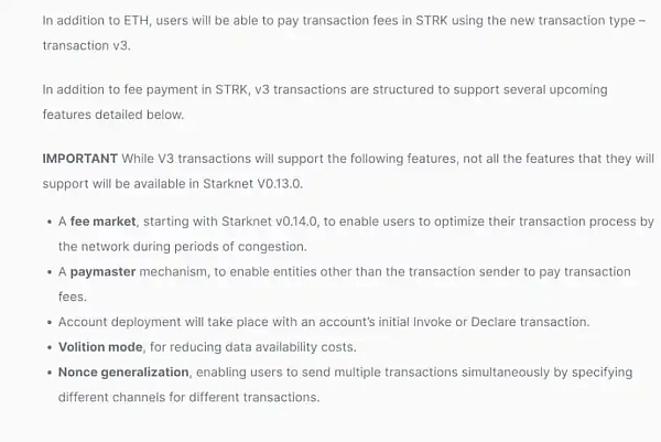 Starknet 正在构建的 V3 交易结构中,将支持以 STRK 支付交易费用。V3 交易结构还将支持以下功能(并非都在 Starknet V0.13.0 中可用):
