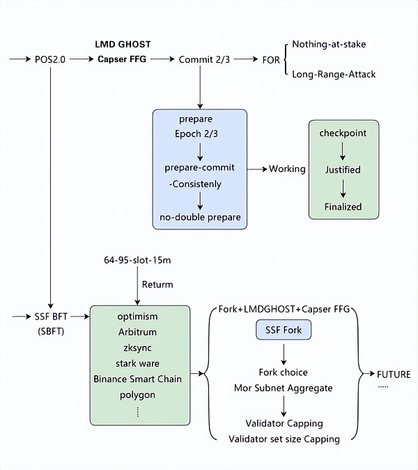 在Alex Obadia团队不断升级后,SSF-拜占庭容错(SBFT语言模型)和该模型将于2026年实现,主要网络将于2025年初启动。SBFT语言的操作逻辑基于原始的LMDGHOST+CAPSER FFG,并使用LMD GHOST分叉算法来选择主链。F使用Casper FFG完成检查站。