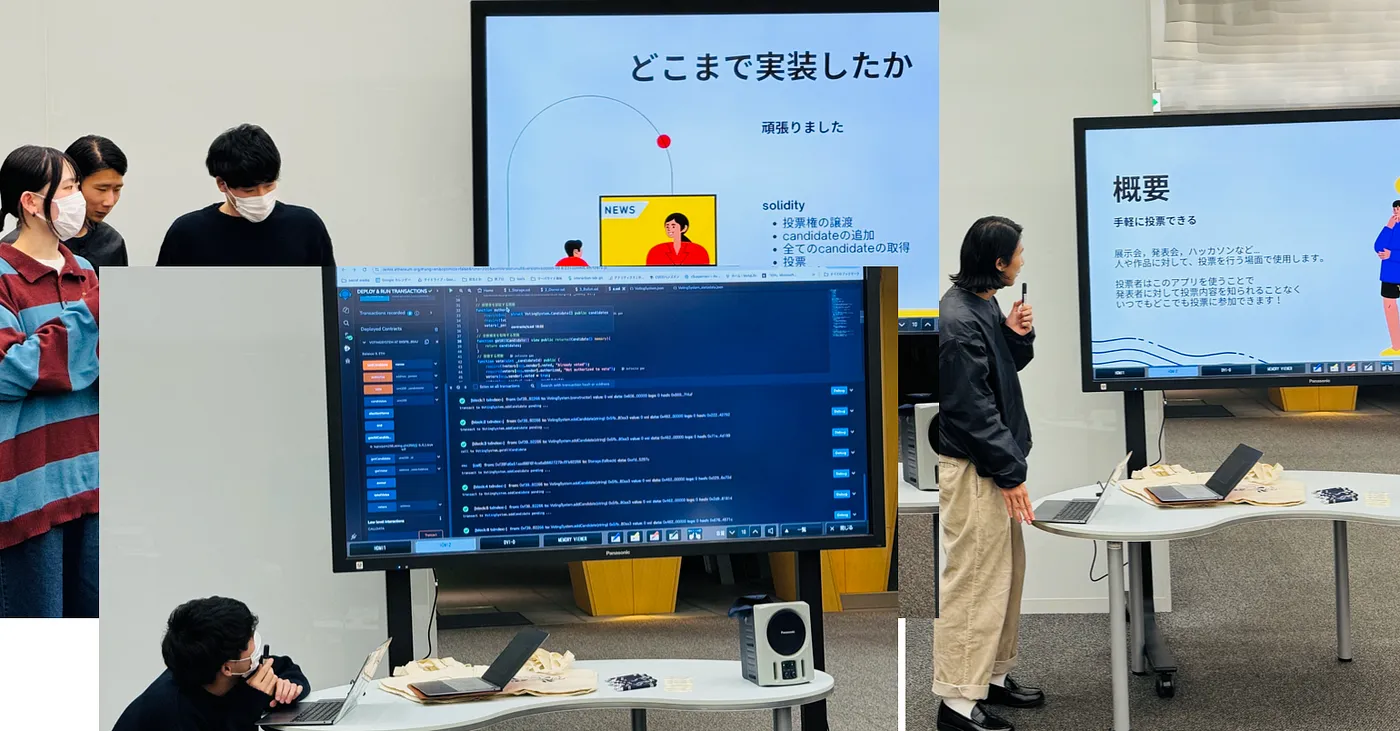 而作为导师的 Web3 全栈工程师、前森山实验室研究生 Kosako 先生则是在黑客松期间开发了一款投票工具智能合约。每个人都可以使用该工具通过区块链投票来选出他们眼中的最佳参赛者(允许每人一票)。其中,有趣的是获得最多票数的,是唯一一位来自人文学科管理部门的学生。