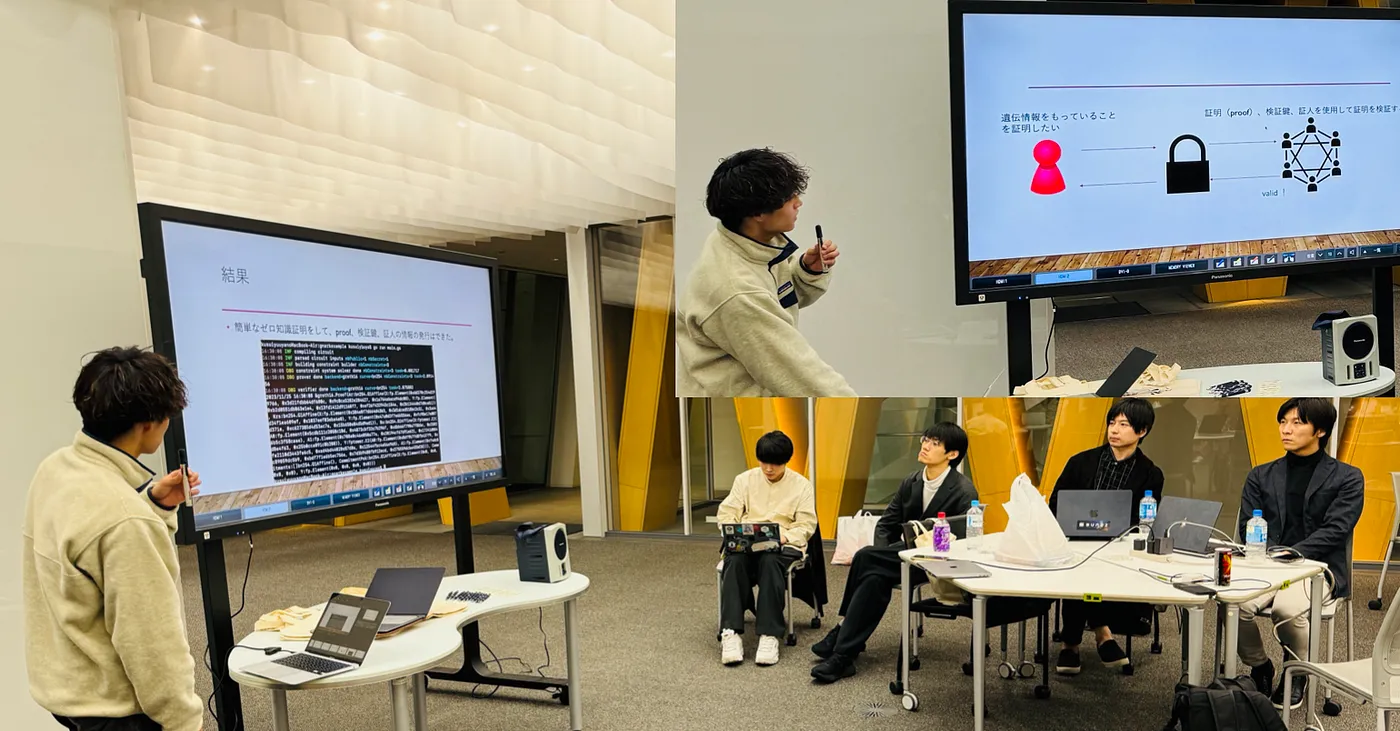 参观过后,黑客松的项目成果展演正式开始!第一个演讲的是森山实验室的研究生代表,他们重点介绍了自己的毕业研究主题 —— 【使用区块链验证遗传信息】,该项目旨在利用零知识证明和智能合约来验证遗传信息的所有权,且同时保护信息隐私,而其当前所面临的挑战是无法直接将个人遗传信息放在区块链上。通过本次黑客松,学生成功完成了简单零知识证明的创建,包括证明、验证密钥和见证人信息的生成。接下来的实行步骤则主要包括调查证明所代表的内容、验证验证智能合约的运行以及使用零知识证明开发验证智能合约。该项目代表了隐私、区块链技术和遗传数据交叉领域向前迈出的重要一步。