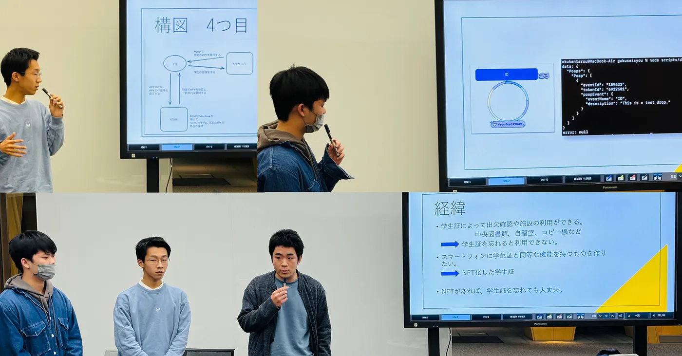 随后进行演讲的团队则聚焦于智能手机兼容及基于 NFT 的学生 ID。他们解释了四种场景,考虑了大学服务器、用户(学生)以及链上和链下动态。他们使用“POAP”(出席证明协议)发行了 NFT,并在 MetaMask 上进行了验证。此外,他们还成功搭建了一个系统,通过将学生的代币 ID 与发行人的代币 ID 进行匹配来确定学生是否拥有特定的 NFT。这种使用 NFT 技术的数字学生 ID 创新方法凸显了教育环境中安全、可验证和便携式身份识别解决方案的潜力。