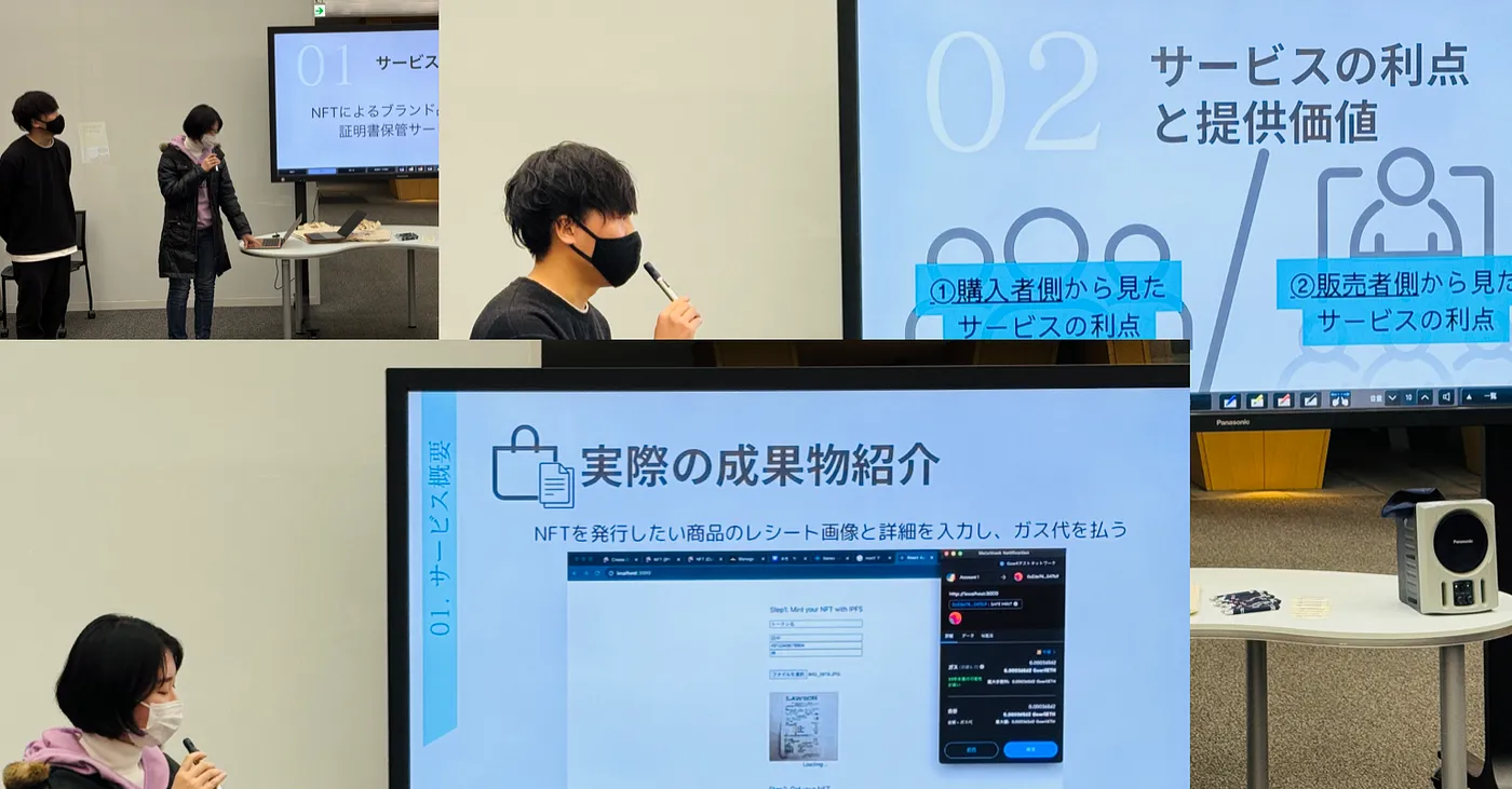 紧接着,由另一个团队进行展演。该团队专注于创建一个使用 NFT 来证明和管理奢侈品购买情况的网站。展演期间,团队成员成功地输入了收据图像以及以 NFT 形式发行的产品详细信息,并顺利跳转至 Gas 费支付页面。此外,他们还展示了预设用户界面和服务设计,并详细阐述了该服务的优势与挑战 —— 例如卖家发行 NFT 的负担以及修改销售条款的必要性,包括撤销 NFT 证明的权利。该项目强调了 NFT 在增强奢侈品的真实性和管理方面的创新应用,解决了将区块链技术融入零售实践所固有的优点及所面对的挑战。