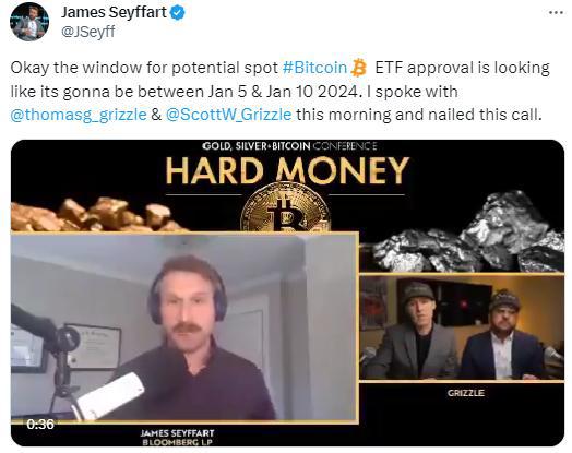 这与Seyffart和同事Eric Balchunas几个月来预测的1月10日一致。它还提出了在12月获得批准的任何可能性,因为美国证监会本周的举动将可能性推至2024年,而Seyffart和Balchunas仍然坚持90%的批准押注。