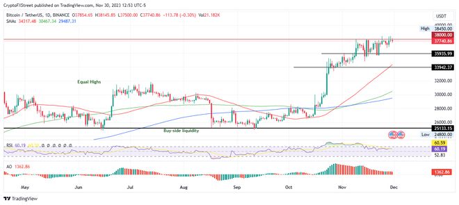 如果多头能够增加购买力,比特币价格突破38000美元的心理水平后,将试图挑战38450美元的区间高点,并触及40000美元的心理水平。