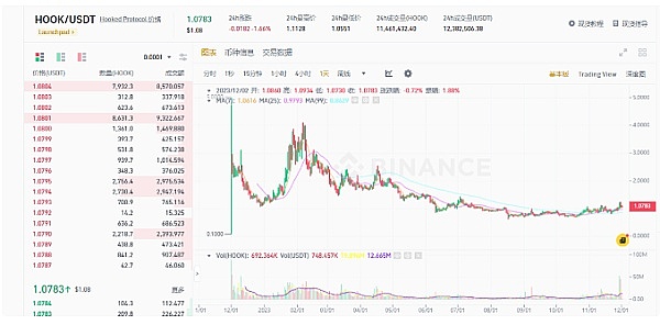 在代币价格方面,我们可以看到HOOK在上线币安之后,代币价格出现了先涨后跌的走势,这主要是早期获利盘出逃所导致的。但是代币价格也经过了10个月左右的盘整,主力基本完成了吸筹操作,交易量和价格也在近期由逐步放大的趋势,也就是有可能会在近期迎来一波拉升。
