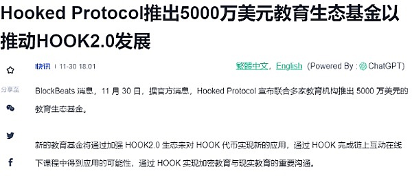 并且刚刚Hooked Protocol 宣布联合多家教育机构推出 5000 万美元的教育生态基金。 新的教育基金将通过加强 HOOK2.0 生态来对 HOOK 代币实现新的应用,通过 HOOK 完成链上互动在线下课程中得到应用的可能性,通过 HOOK 实现加密教育与现实教育的重要沟通。