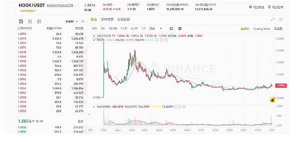 在代币价格方面,我们可以看到HOOK在上线币安之后,代币价格出现了先涨后跌的走势,这主要是早期获利盘出逃所导致的。但是代币价格也经过了10个月左右的盘整,主力基本完成了吸筹操作,交易量和价格也在近期由逐步放大的趋势,并且随着官方继续加大激励和DApp应用场景的力度,讨论量热度增加,可进一步提升估值。