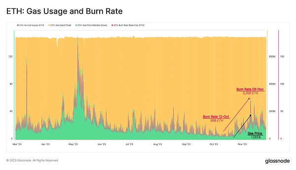 伴随着 gas 价格的上升,这标志着以太坊网络上交易需求的增长,每天销毁的 ETH 费用数量也在增加。在十月,我们看到每天销毁的 ETH 费用达到 899 ETH。快进差不多一个月,累计销毁的费用现在已达到 5,368 ETH。