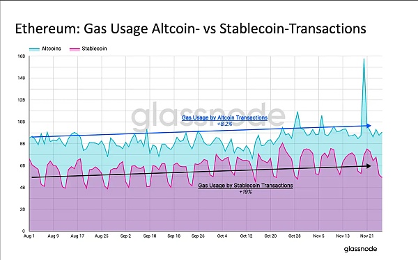 在检查过去四个月主要推动以太坊网络采用的两个领域后,可以明显看到,NFT 交易和 DeFi 交易在过去的四个月中都贡献相对较少,分别下降了-3% 和-57%。这两个领域的采用率都在下降,并且对链上最新活动的贡献很小。