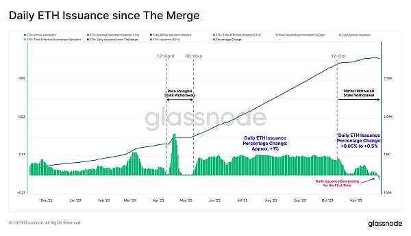 验证者退出的增加导致了每日以太坊发行量的下降,这与质押池内活跃的以太坊数量有关。