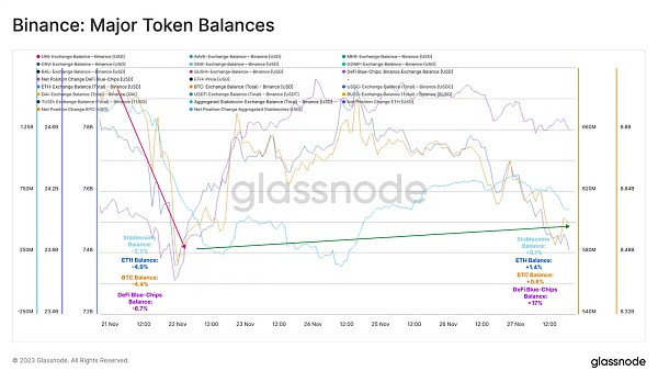 在这则消息之后,币安交易所的主要资产提取活动出现了上升。在最初的 24 小时内,一系列 DeFi「蓝筹股」的综合余额下降了-6.7%,而 BTC、ETH 和稳定币的余额分别下降了-4.4%、-4.9% 和-2.2%。