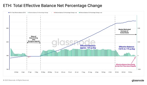 因此,代表在质押池中积极参与权益证明共识的 ETH 的总有效余额在增长速度上有所减缓,目前正经历自上海升级以来的首次下降。