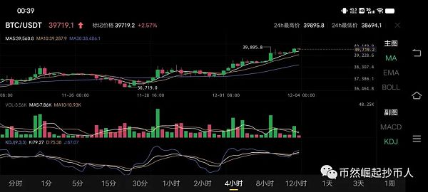 围绕比特币BTC39300-39500附近进场做多,目标为40500附近止盈出局。