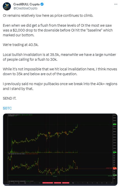 根据技术图表,比特币的下一个阻力位将是 42,330 美元。在 CrediBULL Crypto 提供的最新分析中,观察指出,尽管价格持续上涨,但未平仓合约 (OI) 仍然相对较低。分析强调,历史上 OI 下降的情况导致最高跌幅为 2,000 美元,然后才达到基线,表明可能触底。