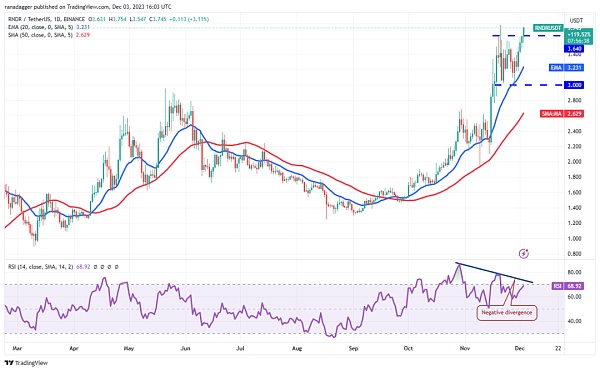11 月 30 日,Render (RNDR) 从 20 日均线(3.21 美元)反弹,表明市场情绪依然乐观,交易者逢低买入