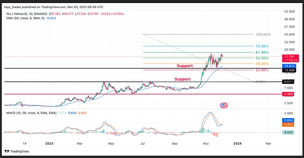 在反弹至 18 美元高点后,INJ/USDT 价格小幅下跌至 13.5 美元区域,该区域形成支撑,价格从该区域反弹至走高至 17.8 美元区域