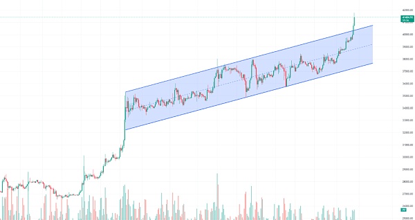 观察到的图表模式表明 BTC/USD 的看涨情绪,特别是如果其维持在 40,000 美元的门槛之上。这种定位表明,只要关键支撑位保持不变,上行轨迹就有可能延续。
