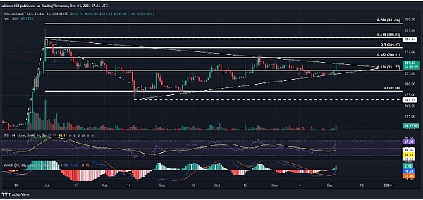 BCH 价格在 2023 年以小幅领先的方式跑赢比特币,准备将持续的上升趋势延续到 2023 年底的更高水平。比特币现金价格趋势同比增长 156%,在日线图上出现对称三角形突破。