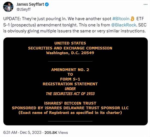 彭博分析师James Seyffart推特发文称,贝莱德已再次向美国证监会提交修订后的比特币现货ETF招股说明书,即S-1文件。此前,Bitwise也递交了第二次修订后的S-1文件。分析师称,美国证监会显然向多个发行人发出了相同或非常相似的指示。