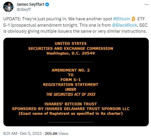 彭博分析师James Seyffart推特发文称,贝莱德已再次向美国证监会提交修订后的比特币现货ETF招股说明书,即S-1文件。此前,Bitwise也递交了第二次修订后的S-1文件。分析师称,美国证监会显然向多个发行人发出了相同或非常相似的指示。