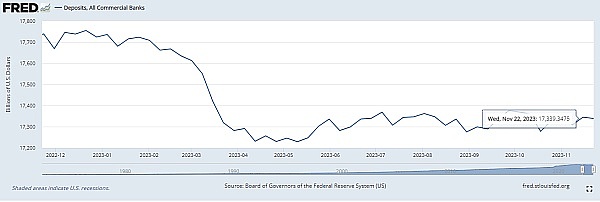 美联储经济数据(FRED)系统的新数据显示,美国所有商业银行的存款从年初的 17.736 万亿美元骤降至截至 11 月 22 日的 17.339 美元。总计减少了 3,970 亿美元。