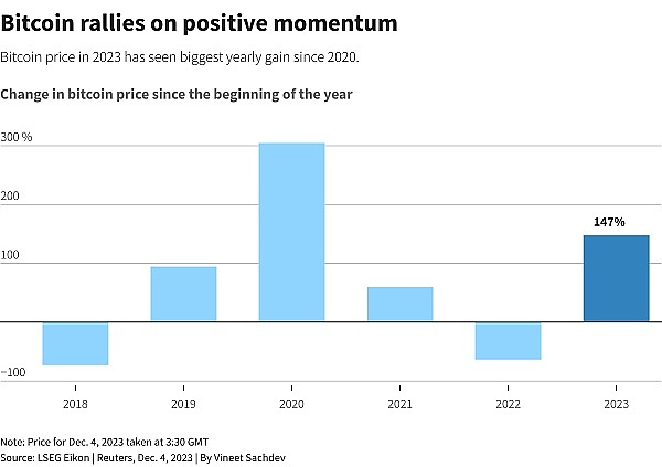 根据 Tradingview 数据显示,北京时间 12月 4日 12:30,比特币突破 41700 美元价格达到 2023 年以来的最高点位,在过去 7 天内上涨了近 10% 。