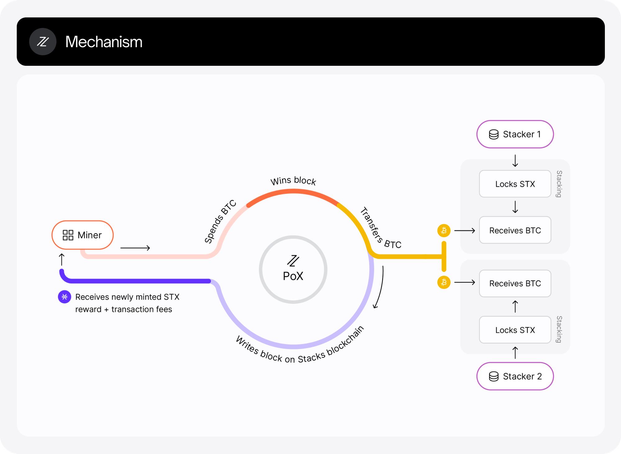 Stacks通过PoX的双重螺旋机制实现共识,矿工发送BTC给STX质押者以竞争出块资格,成功赢得出块资格的矿工在顺利完成出块后能够获得STX奖励。在这个过程中STX的质押者能够按照比例获得矿工发送的BTC。Stacks希望通过发行原生token来激励矿工维护历史账本,但实际上没有原生token也能实现激励(见RSK)。